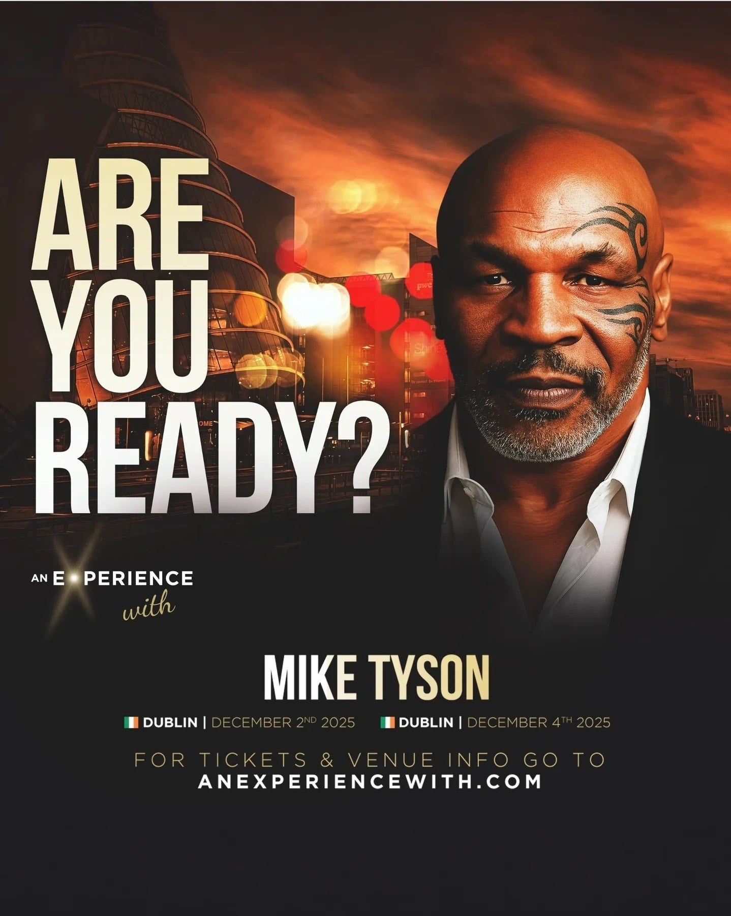 Mike Tyson is scheduled to appear at two "An Experience With" events in Dublin, Ireland, onDecember 2nd and December 4th, 2025. These events are part of a series of black-tie dinners celebrating his life, offering an intimate atmosphere with exquisite dining and entertainment.