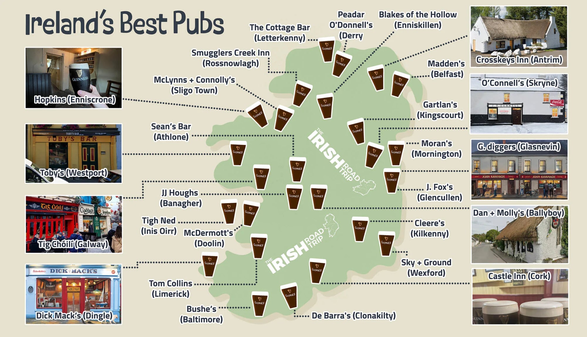 The Best Pubs In Ireland. The vast majority of the places below are old-school, traditional Irish bars (most of which pour a decent pint of Guinness!).